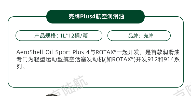 AeroShell Oil Sport Plus 4机油适用于四冲程飞机活塞式发动机,传统无灰分散剂飞机发动机机油类型。这些引擎包括化油器、燃油喷射和涡轮增压型,如ROTAX®912和914系列。
