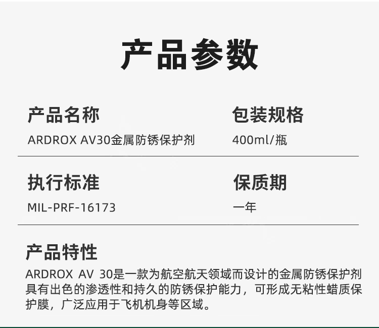 AV30防腐剂适用范围:用于飞机机身、发动机舱等区域的防锈保护