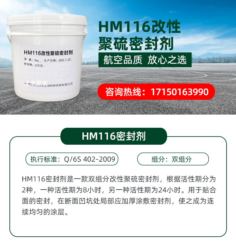 hm116密封剂活性期为8小时和24小时两款;适合于大部件施工,工艺规格分为C 类;-55℃~120℃,短期 180℃;配合NJD-3底涂。