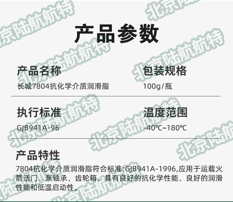 长城7804号抗化学介质润滑脂是一种氟类特种润滑剂,其基础油是全氟聚醚(PFPE)。7804号脂具备较好的化学惰性:不燃烧、耐辐射、耐强酸、耐强氧化剂,同时其还具备良好的材料适应能力。目前该脂在航天领域已经应用多年,性能好、稳定。