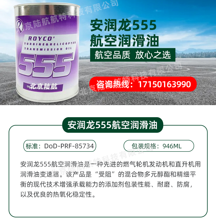 安润龙555航空润滑油是一种先进的燃气轮机发动机和直升机用润滑油变速器。该产品是“受阻”的混合物多元醇酷和精细平的现代技术增强承载能力的添加剂包装性能、耐磨、防腐以及优良的热氧化稳定性。