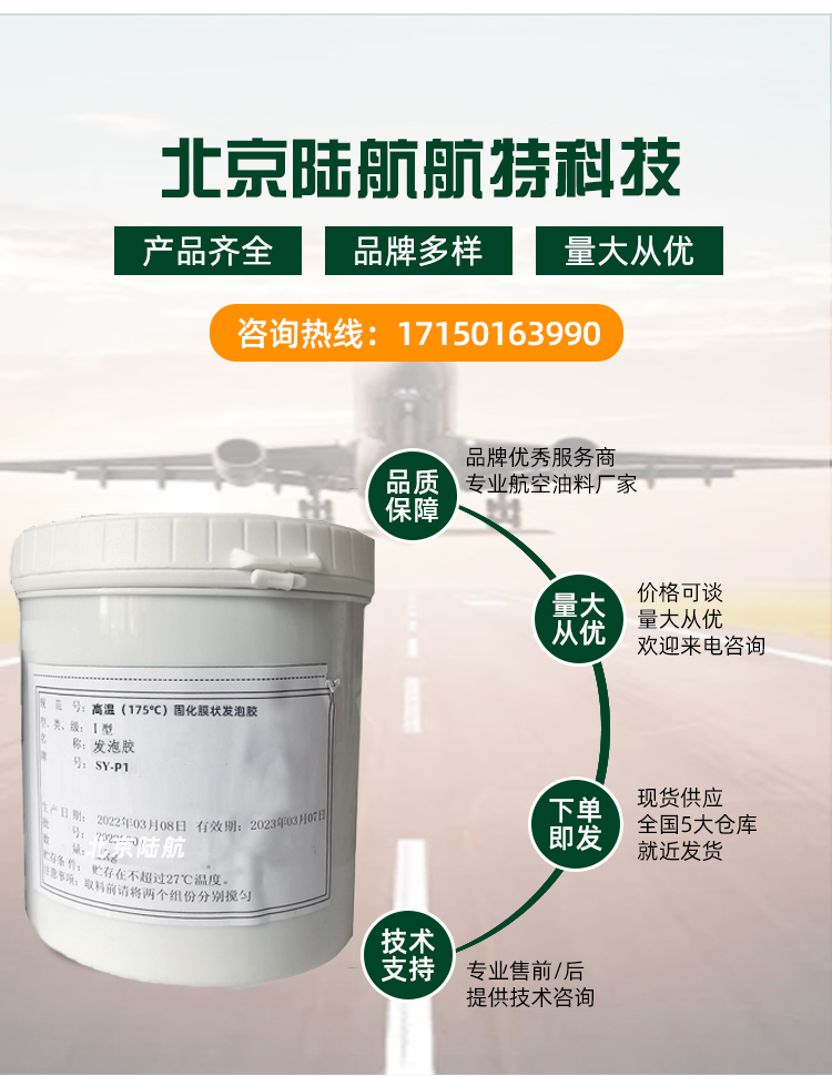SY-P1发泡胶系改性环氧单组分高温固化膜状结构胶粘剂,具有一定的自粘性,在常温条件下可借助电吹风进行封边贴合及蜂窝芯拼接组装,供应状态为成卷或平装无载体胶膜,可用于金属蜂窝及非金属蜂窝承力构件的制造,在 -55~150°C可长期使用,已用于轰炸机金属蜂窝舵面的蜂窝芯拼接及边缘连接、碳纤维复合材料副翼边缘连接。