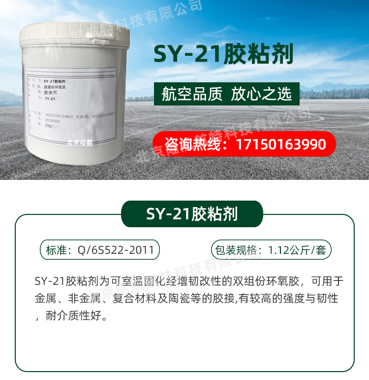 SY-21胶粘剂为可室温固化经增韧改性的双组份环氧胶,可用于金属、非金属、复合材料及陶瓷等的胶接,有较高的强度与韧性,耐介质性好。