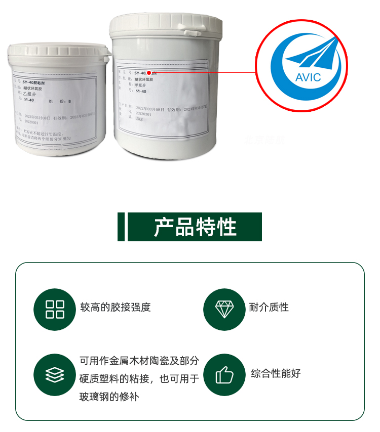 SY-40胶粘剂是一种双组分室温固化耐热胶粘剂,具有较高的胶接强度和耐介质性能,可用作金属、木材、陶瓷及部分硬质塑料的粘接,也可用于玻璃钢的修补。