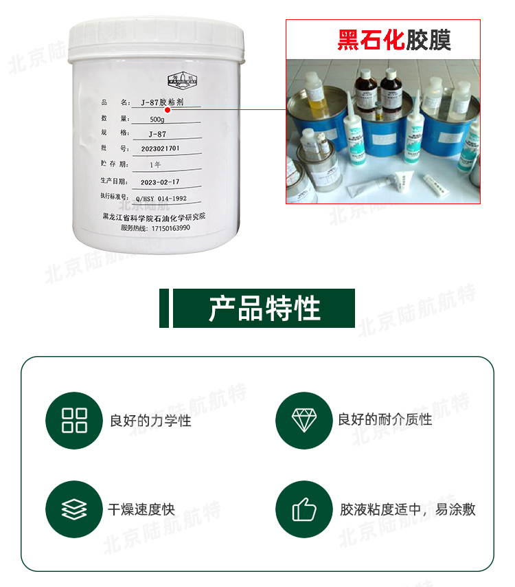 J-87胶粘剂即J-87丁腈橡胶胶粘剂,执行标准Q/HSY 014-1992。是黑龙江省石油化学研究院研发生产的一款胶粘剂,J-87胶粘剂系以丁腈橡胶、酚醛树脂为主体材料的单组分胶粘剂。具有耐介质性能好,干燥速度快等优点,适用于织物、非金属材料与金属材料的粘接。