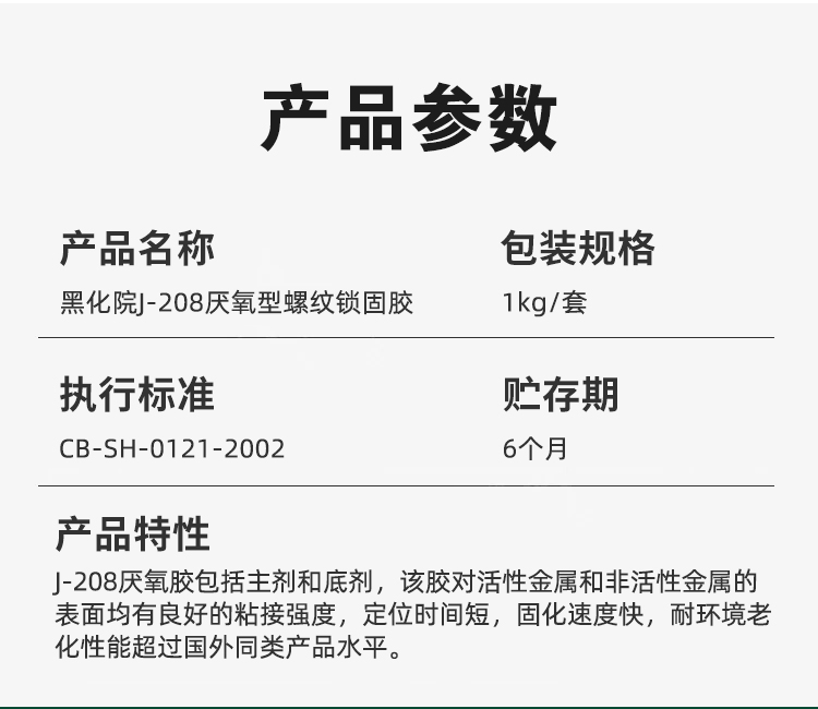 J-208 厌氧型螺纹锁固密封胶具有固化速度适宜,耐溶剂,耐高低温,对粘接物无腐蚀性,操作简单,综合性能良好等特点。适用于易腐蚀金属螺纹件的锁固和密封。使用温度范围为-55~150℃。